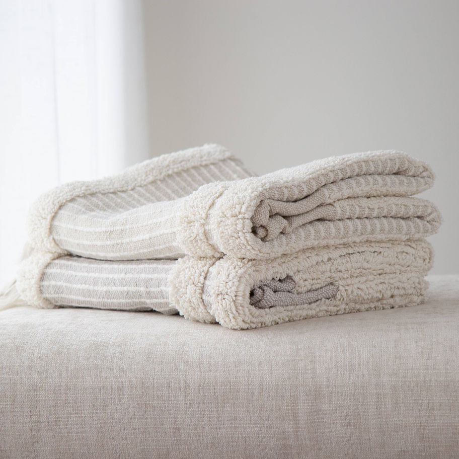 Our Oyster Throw Blanket with Personalized Tag is handwoven by skilled artisans using traditional techniques and features tufted stripes for a unique boutique-style charm. Its ultra-soft luxurious feel and neutral color palette effortlessly complement any home decor. Personalize it with your own logo or a special quote on the tag for a truly bespoke touch. Perfect for adding coziness to chairs, sofas, or beds, this throw makes for a thoughtful and stylish gift.